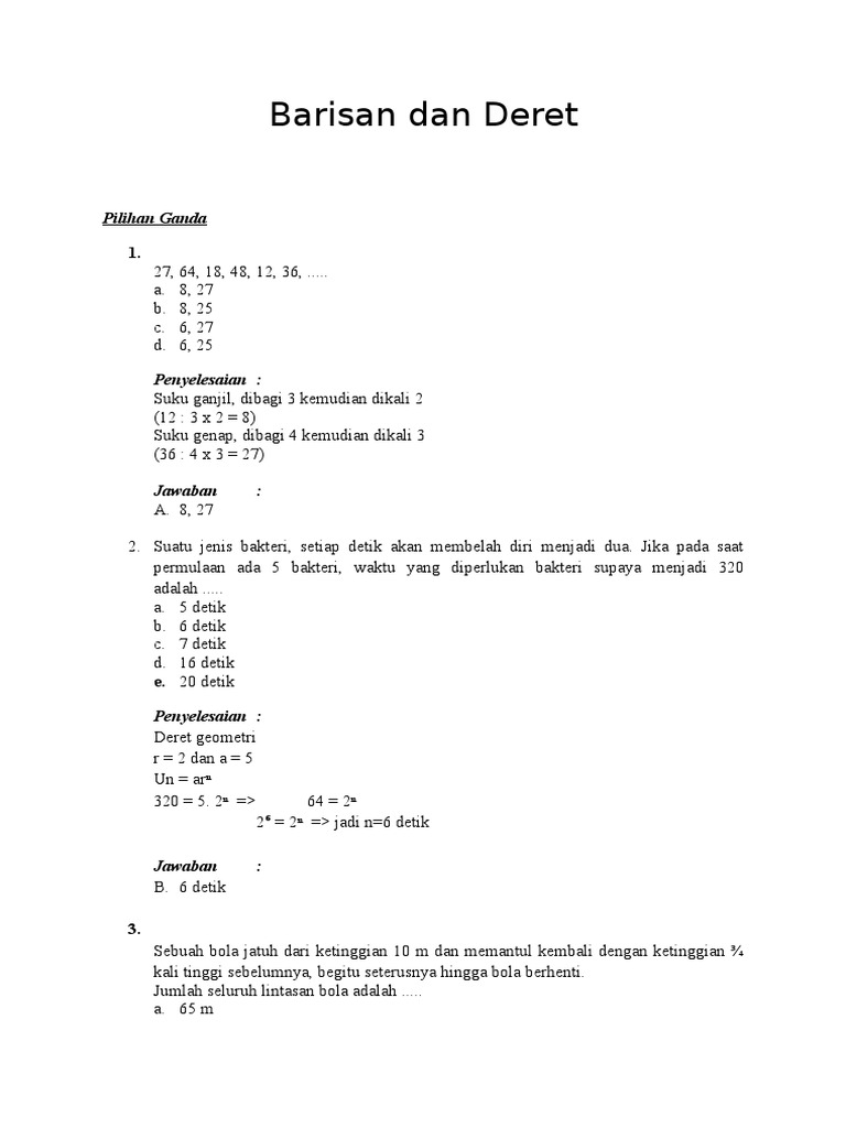 Jawab Agar kamu lebih memahami materi ini, pelajarilah contoh-contoh soal berikut. Soal-soal ini dikumpulkan dari berbagai sumber termasuk soal UN maupun SBMPTN. Barisan merupakan urutan dari suatu anggota-anggota himpunan berdasarkan suatu aturan tertentu.